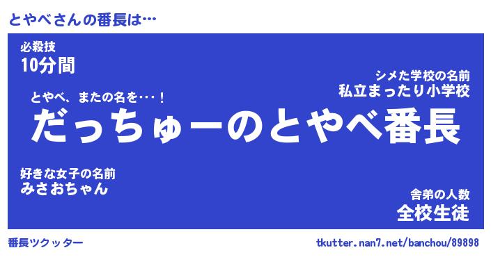 | 肩書あだ名 | 『とやべ社長』『とやべ総理大臣』 |