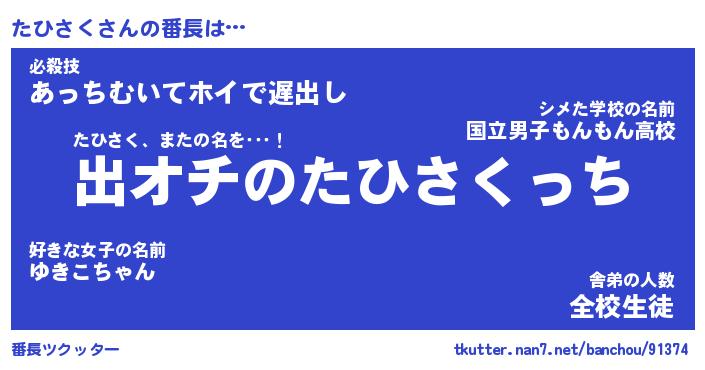 | ヒーロー風カッコイイあだ名 | 『スーパータヒサク』『暗黒騎士タヒ』 |