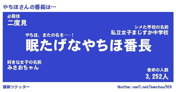 | ヘコむあだ名 | 『やちにゅー』『なまこ酢』『やちお』 |