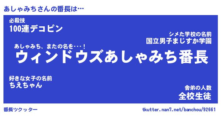 | ファンタジー風あだ名 | 『アシフェル』『エターナルアシャミチー』 |