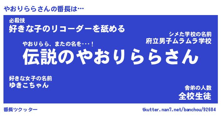 | 肩書あだ名 | 『やおりらら店長』『やおりらら大統領』 |