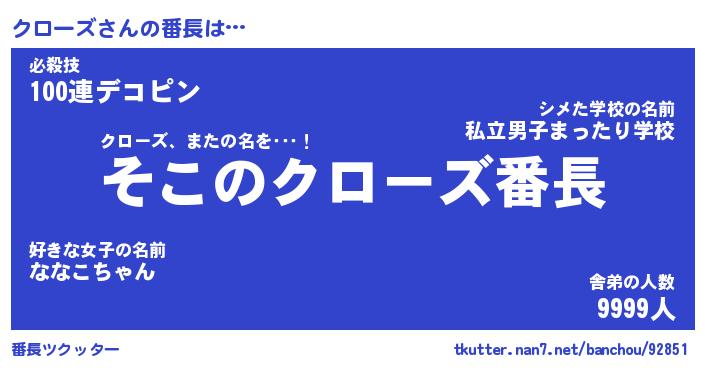 | 意味不明あだ名 | 『ペロリンクローズ』『永久保存クローズ』 |