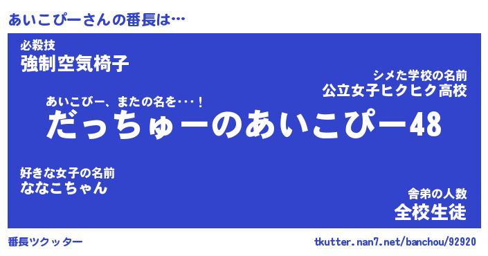 | 肩書あだ名 | 『あいこぴー店長』『あいこぴー国家主席』 |