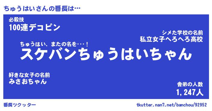 | ヒーロー風カッコイイあだ名 | 『スーパーチュウハイ』『銀牙騎士チュ』 |