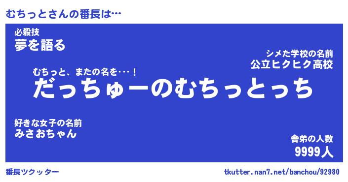 | ヒーロー風カッコイイあだ名 | 『スーパームチット』『天弓騎士ムチ』 |