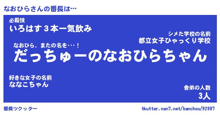 | ヒーロー風カッコイイあだ名 | 『スーパーナオヒラ』『銀牙騎士ナオ』 |