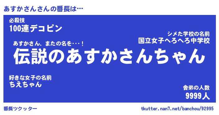 | 伝説のあだ名 | 『伝説のスナイパーあすかさん』 |
