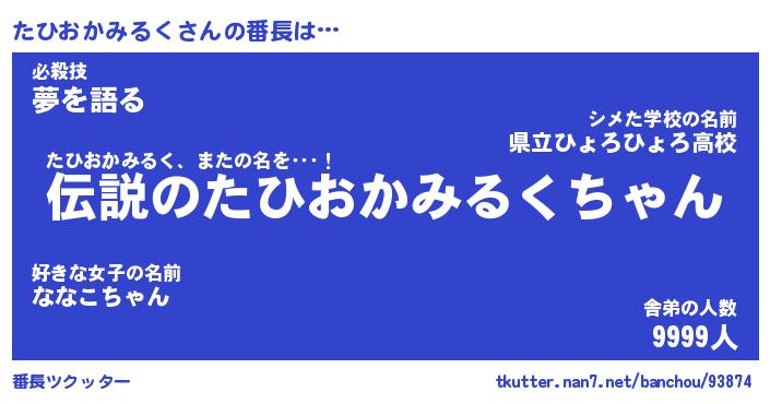 | 男性向けラノベタイトル風あだ名 | 『たひおかみるくの憂鬱』 |