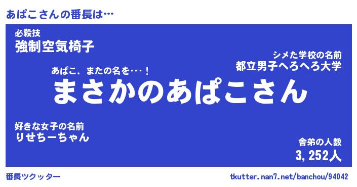 | ヒーロー風カッコイイあだ名 | 『スーパーアパコ』『ウルトラあぱこマン』 |