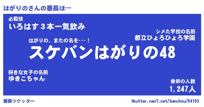 | ピコ太郎風あだ名 | 『ハコ五郎』『ピハ八郎』『ハガ四郎』 |