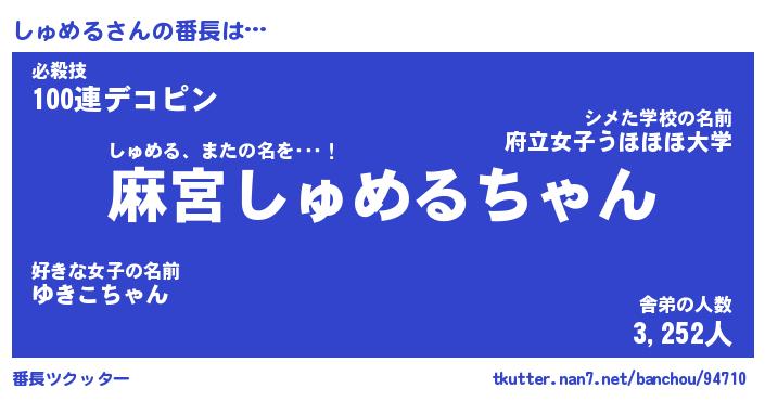| 意味不明あだ名 | 『ペロリンしゅめる』『永久保存しゅめる』 |