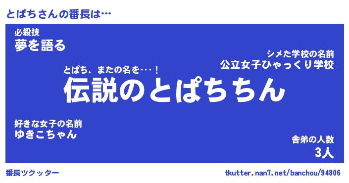 | ヒーロー風カッコイイあだ名 | 『スーパートパチ』『ウルトラとぱちマン』 |