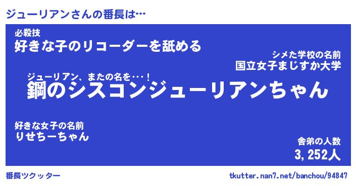| 恥ずかしいあだ名 | 『プリティージューリアン』『ジュっちょ』 |