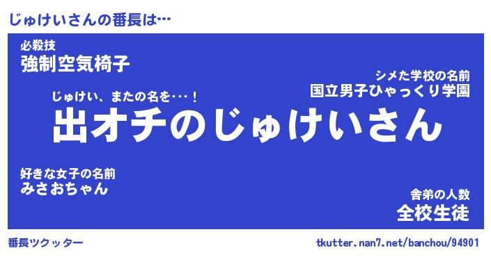 | ヒーロー風カッコイイあだ名 | 『スーパージュケイ』『暗黒騎士ジュ』 |