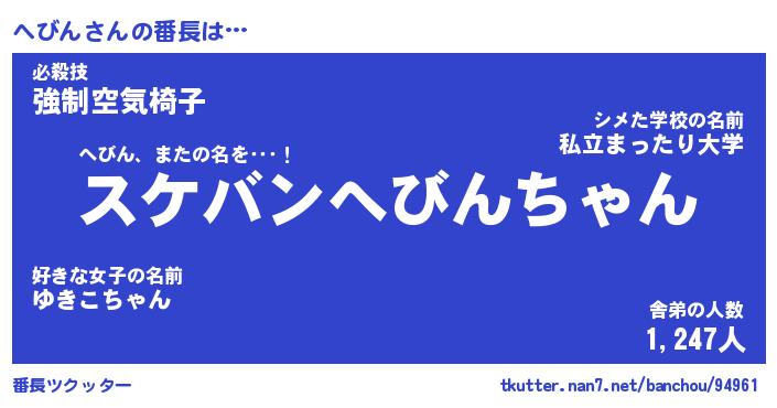 | ピコ太郎風あだ名 | 『ヘコ太郎』『ピヘ六郎』『ヘビ十郎』 |