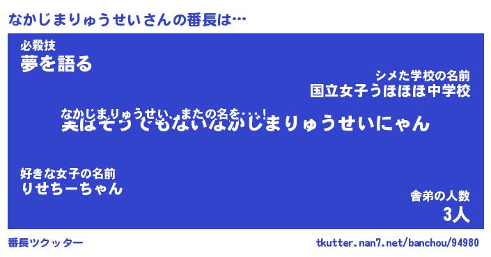 | ヒーロー風カッコイイあだ名 | 『スーパーナカジマリュウセイ』 |
