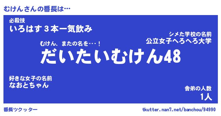 | 意味不明あだ名 | 『ペロリンむけん』『むけんフォーエバー』 |