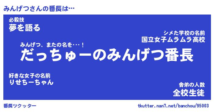 | 肩書あだ名 | 『みんげつ店長』『みんげつ総理大臣』 |