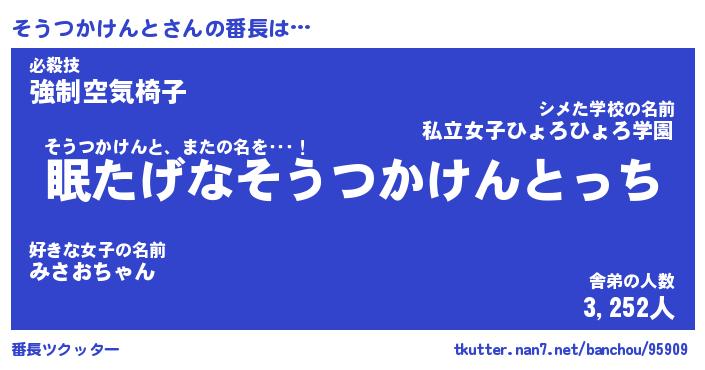 | 男性向けラノベタイトル風あだ名 | 『ソウツカケントアートオンライン』 |