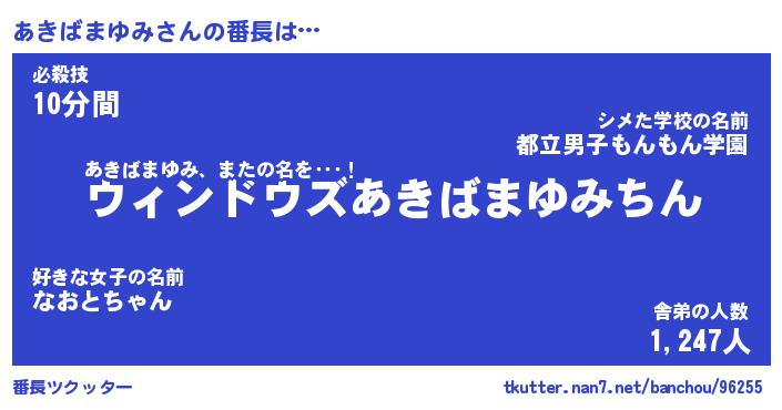 | 肩書あだ名 | 『あきばまゆみ社長』『あきばまゆみ班長』 |