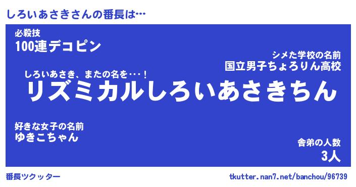 | 肩書あだ名 | 『しろいあさき店長』『しろいあさき先生』 |