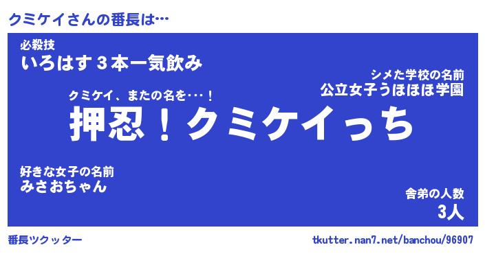 | ヒーロー風カッコイイあだ名 | 『スーパークミケイ』『炎刃騎士クミ』 |