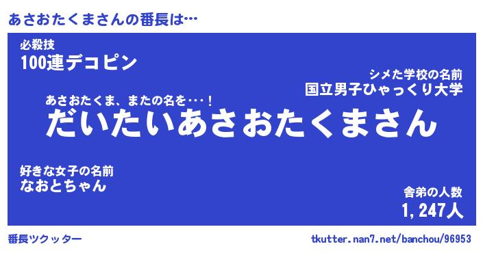 | 伝説のあだ名 | 『不死鳥のスナイパーあさおたくま』 |