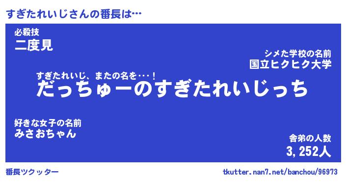 | 伝説のあだ名 | 『伝説のスナイパーすぎたれいじ』 |