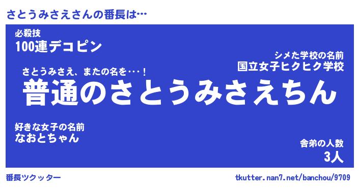 | ヒーロー風カッコイイあだ名 | 『スーパーサトウミサエ』『天弓騎士サト』 |