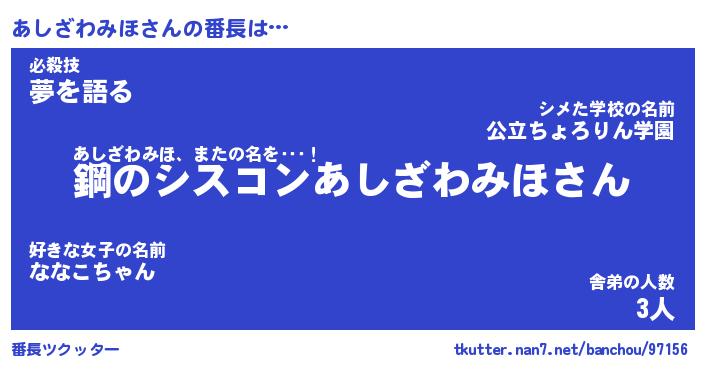 | ヒーロー風カッコイイあだ名 | 『スーパーアシザワミホ』『銀牙騎士アシ』 |