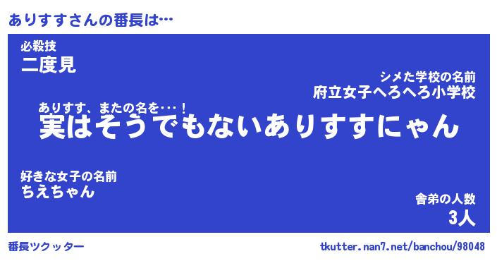 | 意味不明あだ名 | 『ペロリンありすす』『永久保存ありすす』 |