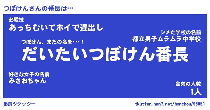 | 伝説のあだ名 | 『不死鳥のスナイパーつぼけん』 |