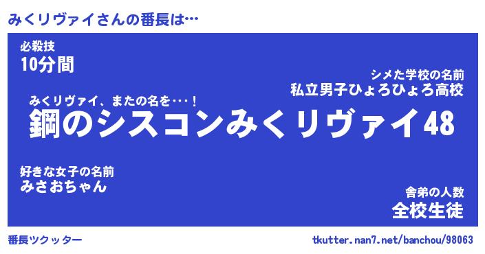 | 伝説のあだ名 | 『封印されしスナイパーみくリヴァイ』 |