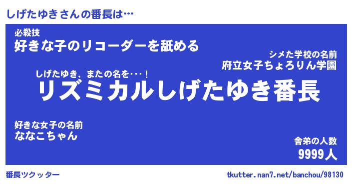 | 肩書あだ名 | 『しげたゆき店長』『しげたゆき国家主席』 |