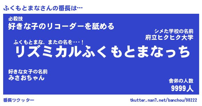 | ヘコむあだ名 | 『ふくにー』『なまこ酢』『ふくっぺ』 |