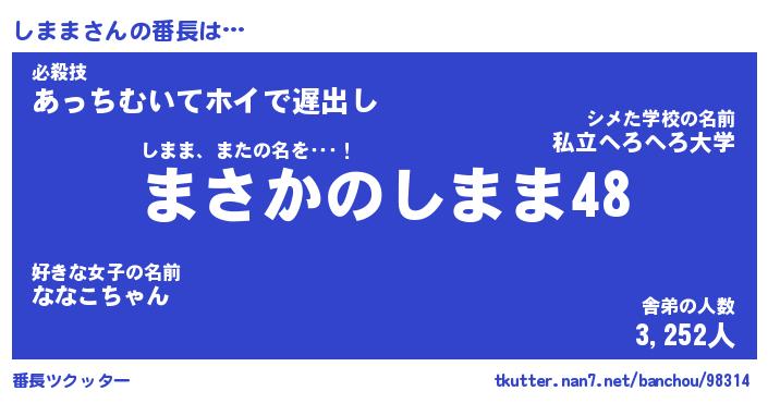 | ヒーロー風カッコイイあだ名 | 『スーパーシママ』『ウルトラしままマン』 |
