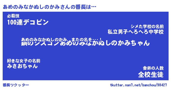 | 伝説のあだ名 | 『封印されしスナイパーあめのみなかぬしのかみ』 |
