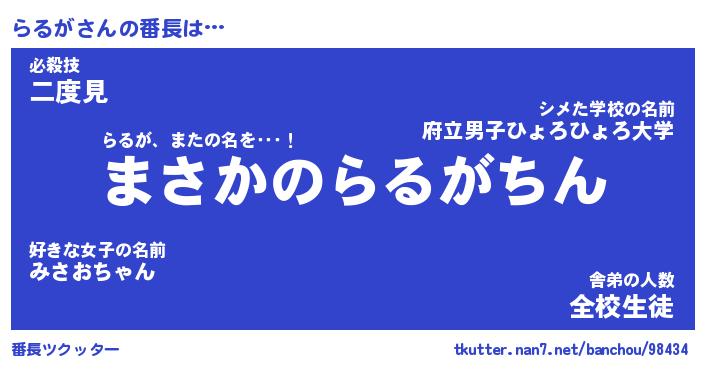 | ヘコむあだ名 | 『らるにー』『牛乳』『らるっぺ』 |