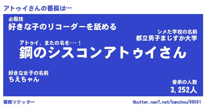| 意味不明あだ名 | 『ペロリンアトゥイ』『永久保存アトゥイ』 |