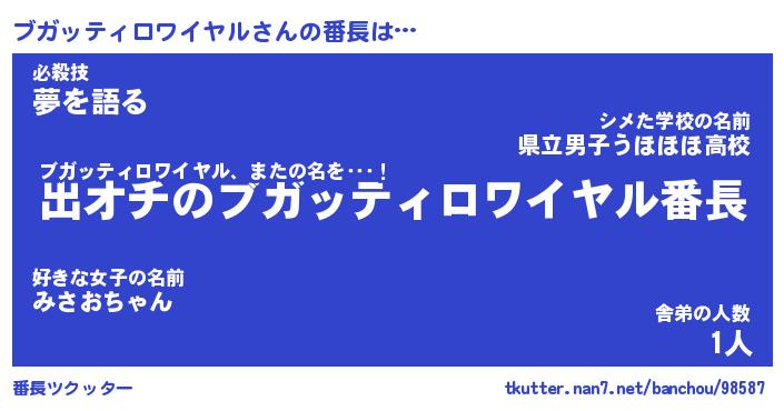 | 伝説のあだ名 | 『伝説のスナイパーブガッティロワイヤル』 |