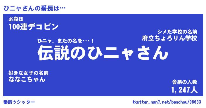 | 伝説のあだ名 | 『伝説のスナイパーひニャ』 |