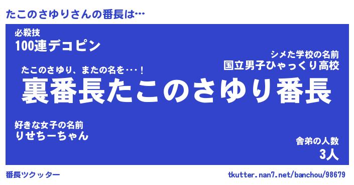 | 伝説のあだ名 | 『不死鳥のスナイパーたこのさゆり』 |