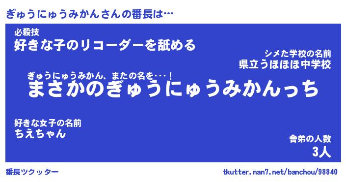 | 意味不明あだ名 | 『ペロリンぎゅうにゅうみかん』 |