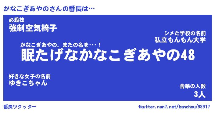 | 伝説のあだ名 | 『封印されしスナイパーかなこぎあやの』 |