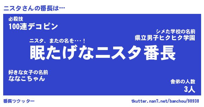 | ヒーロー風カッコイイあだ名 | 『スーパーニスタ』『ウルトラニスタマン』 |