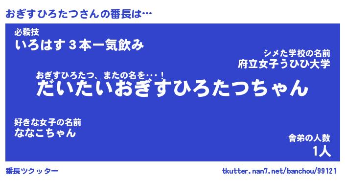 | 男性向けラノベタイトル風あだ名 | 『おぎすひろたつの憂鬱』 |