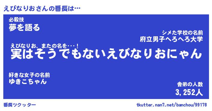 | 肩書あだ名 | 『えびなりお御曹司』『えびなりお大統領』 |