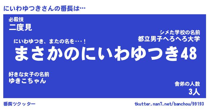| ヒーロー風カッコイイあだ名 | 『スーパーニイワユツキ』『黄金騎士ニイ』 |