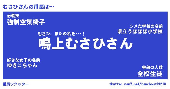 | 2回繰り返すあだ名 | 『むさむさ』『むむささ』『うねうね』 |