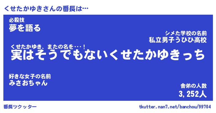| 伝説のあだ名 | 『封印されしスナイパーくせたかゆき』 |